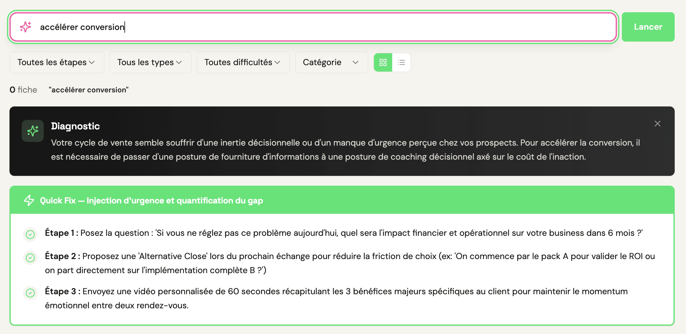Explique ton problème en langage naturel, l’IA te recommande les tactiques les plus adaptées à ta situation.
